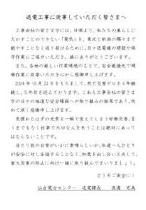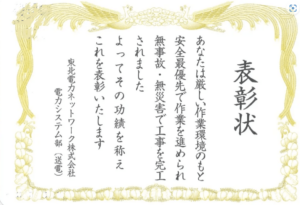 東北電力ネットワーク株式会社 仙台電力センターより、当社の4現場において当社社員が厳しい作業環境のもと 安全最優先で作業を進め無事故無災害での完工した事に対して表彰状が授与されました。