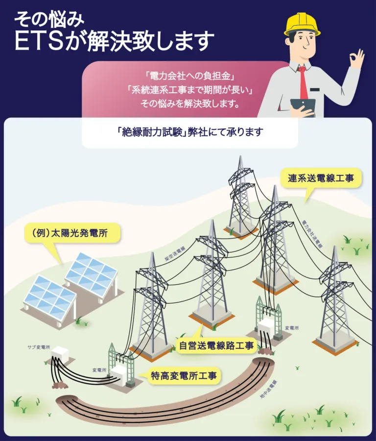 電力会社への負担金や系統連系までの期間でお悩みの事業主様、そのお悩みをETSラインが解決いたします。まずはお問い合せ下さい。太陽光発電所における『絶縁耐力試験』も弊社にて承ります!