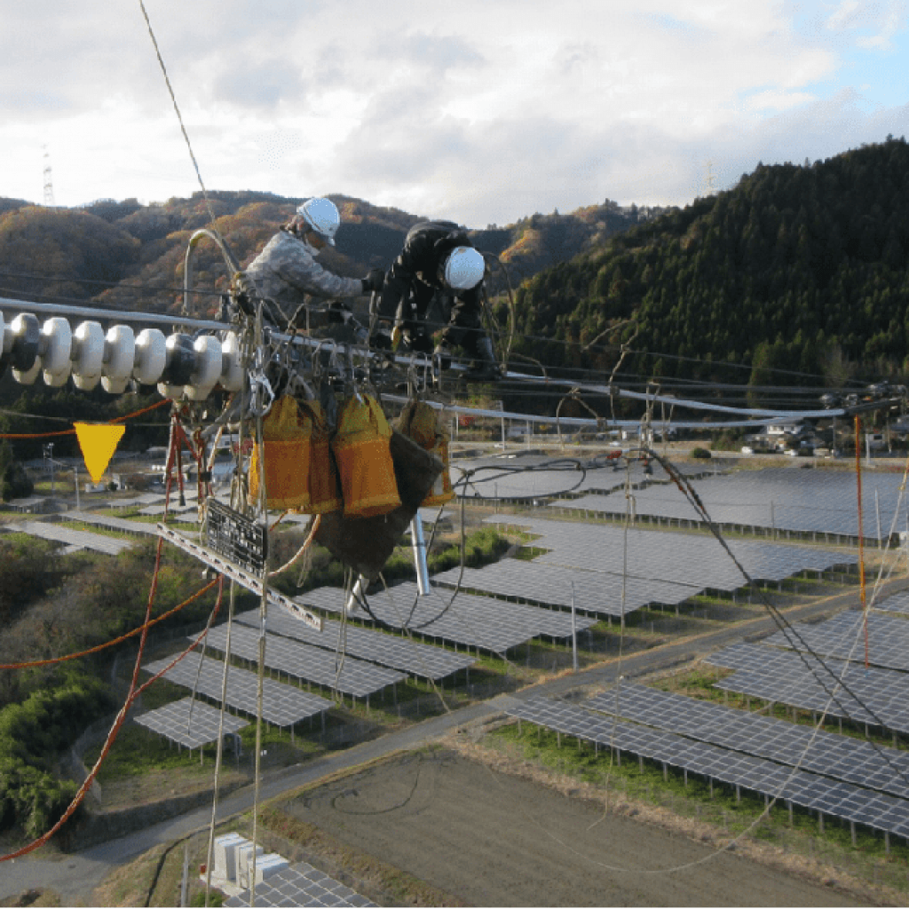 送電線や設備工事のほか再生可能エネルギーにも注力。近年では地球温暖化を防止するため、CO2削減をはじめとする様々な取り組みが世界的に進められており、化石エネルギーからクリーンエネルギーへの移行で再生可能エネルギーが注目を浴びています。弊社はこれまで培ってきた技術力を活かし、太陽光発電等の再生可能エネルギー発電所建設工事にも注力しております。